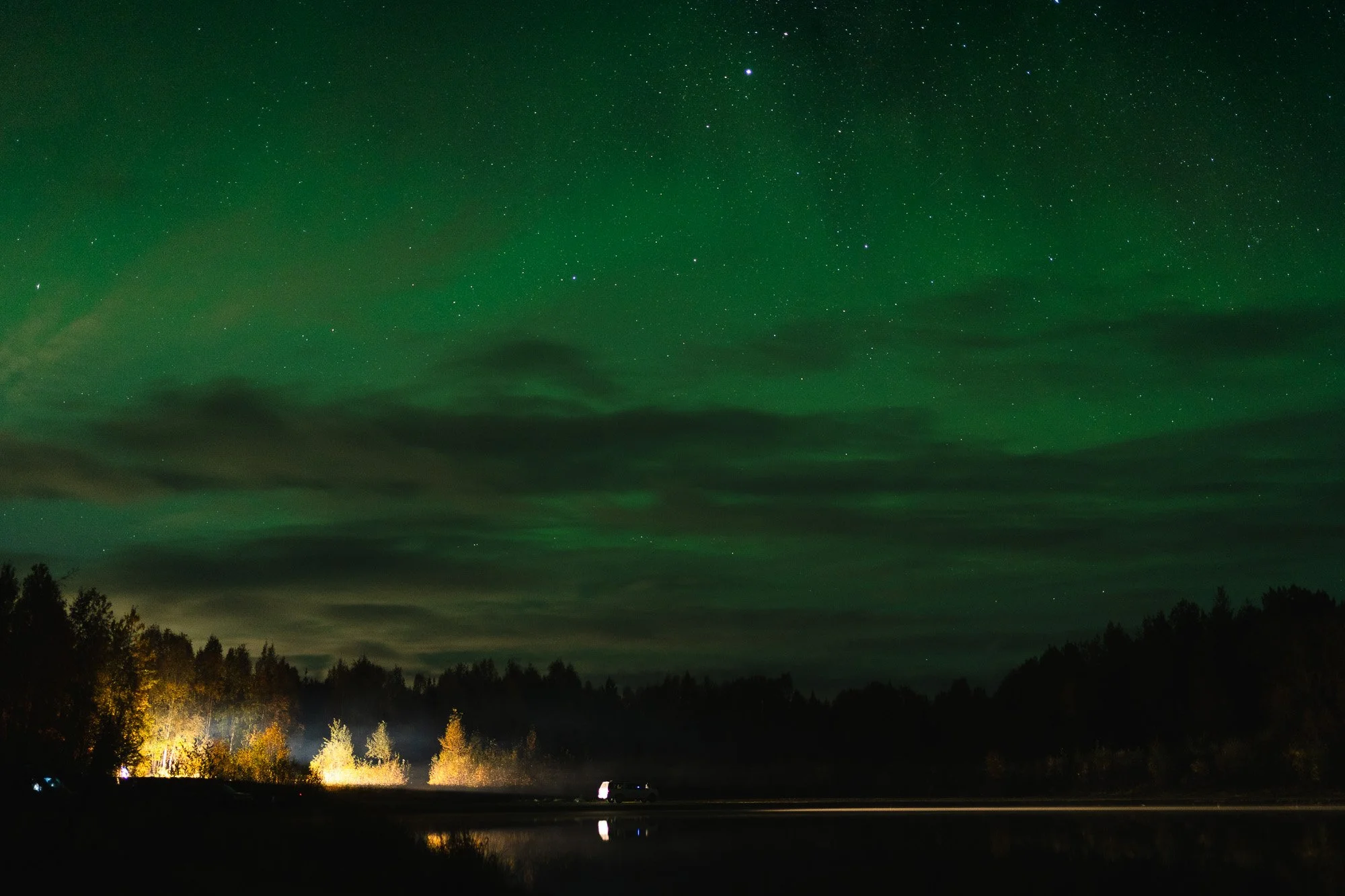 Aurora activity is usually higher around the equinox and we’re approaching a solar maximum (10-11 year cycles with above average solar activity). We took a chance to head up to Fairbanks for some Aurora chasing. Every night was cloudy, except for a small window on our last night. Luckily, there was a huge solar storm that lit up the entire sky. This shot is facing south as car headlights light up the fall foliage surrounding Olnes pond.