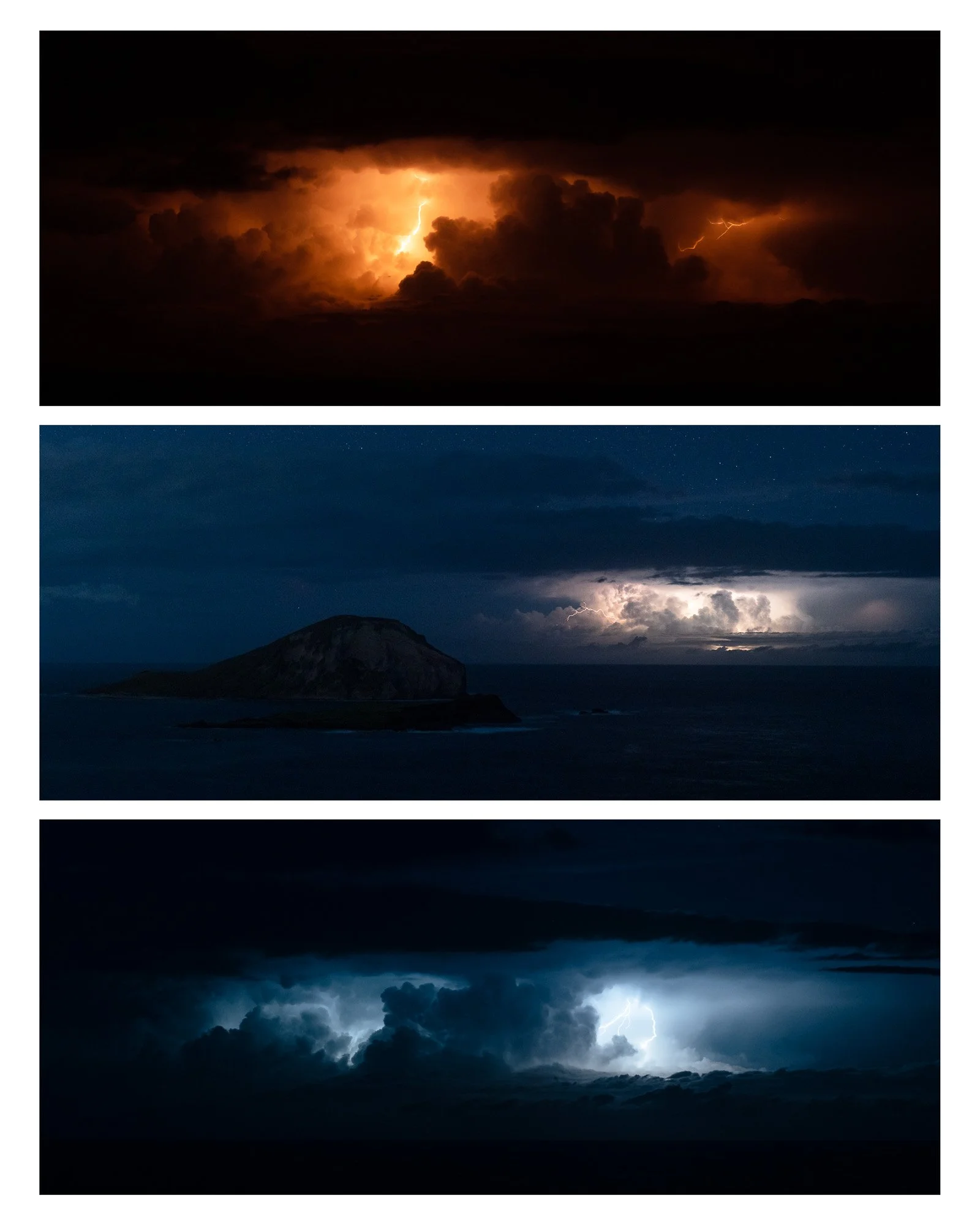 This evening I was in my driveway taking pictures of a setting crescent moon and Venus. My buddy, Aaron (IG @aaronmizu/@mizushimaphotography), calls me and tells me to pack my camera gear and head around the corner to Makapu’u. This lightning storm was far off in the channel so we stayed completely dry. It was crazy how consistent the lightning was.