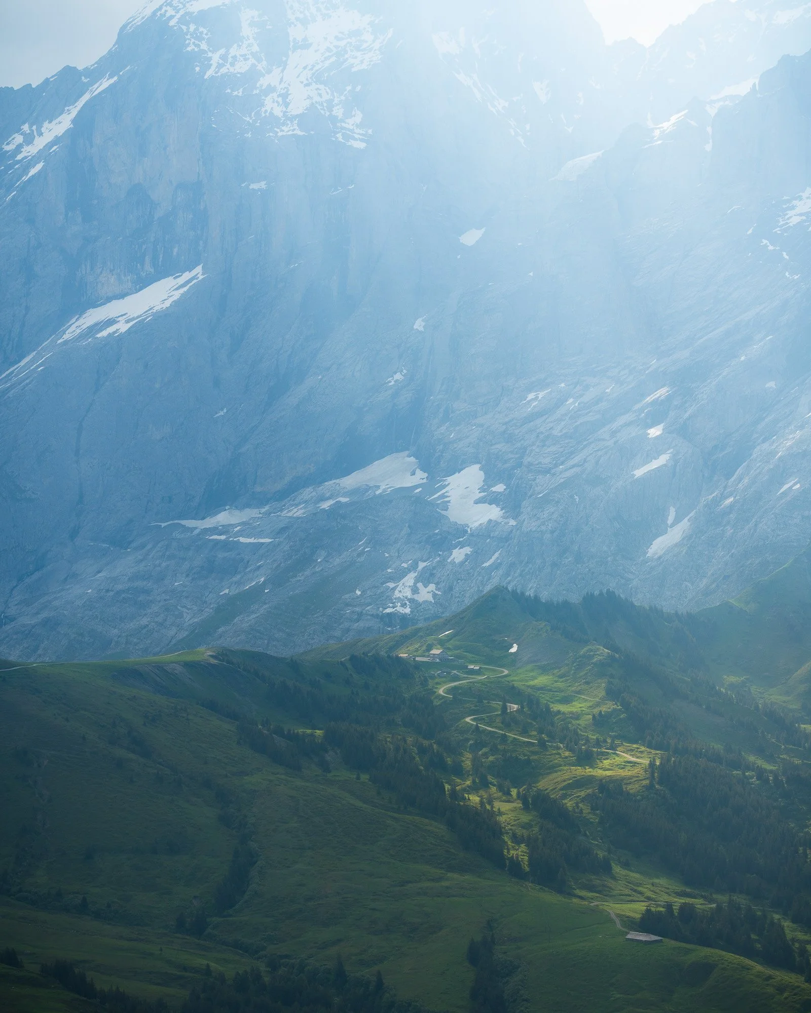 The Swiss Alps. You can feel your blood pressure lowering here. And I needed it after the nightmare layover at London Heathrow airport. These mountain and valley towns are plucked straight out of a fairy tale (or the Sound of Music). From the glaciated mountains, the wild flowers in Summer, and the sound of cow bells, this place is amazing. In this shot you have sun rays peaking over the mountain, lighting up a winding path.