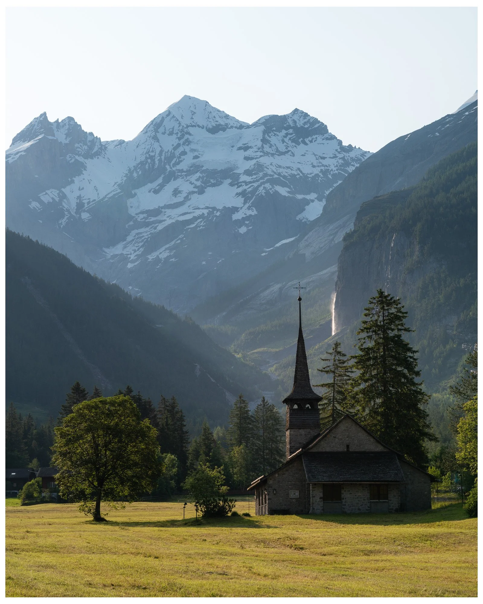 Kandersteg. Beautiful morning light catches one of the many waterfalls in the area and an old stone church. We took a gondola up to a trail that leads to an alpine lake (Oeschinensee) and then had the best chips and beer before heading back to Bern.