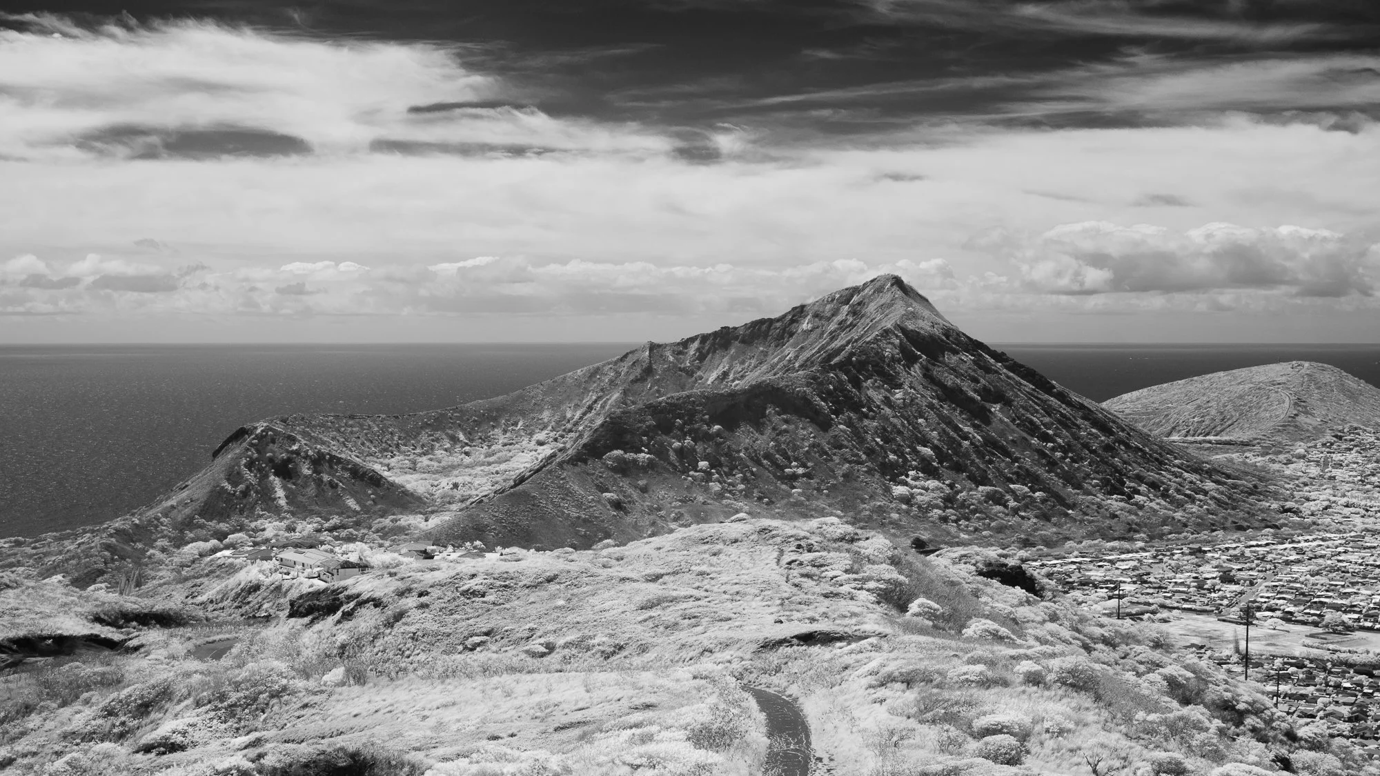 I’ve been working on a collection of Koko Crater images for a couple years. This extinct volcano is my mini Mount Fuji. Unlike the perfect conical shape of Fuji, Koko Crater can look different based on your point of view. Here are all my recent attempts in infrared, converted to simple black and white.